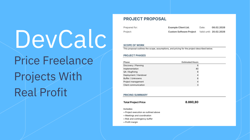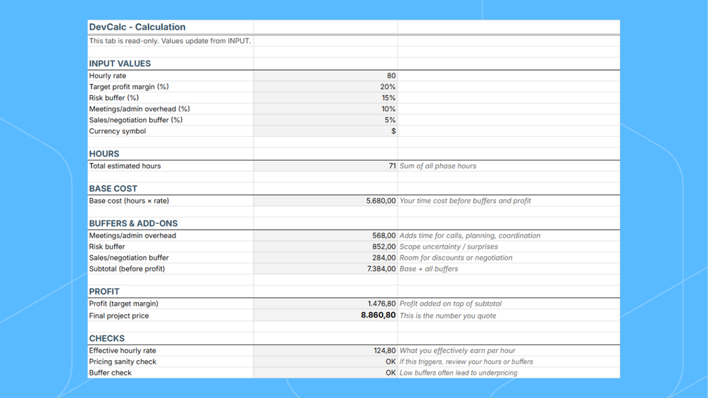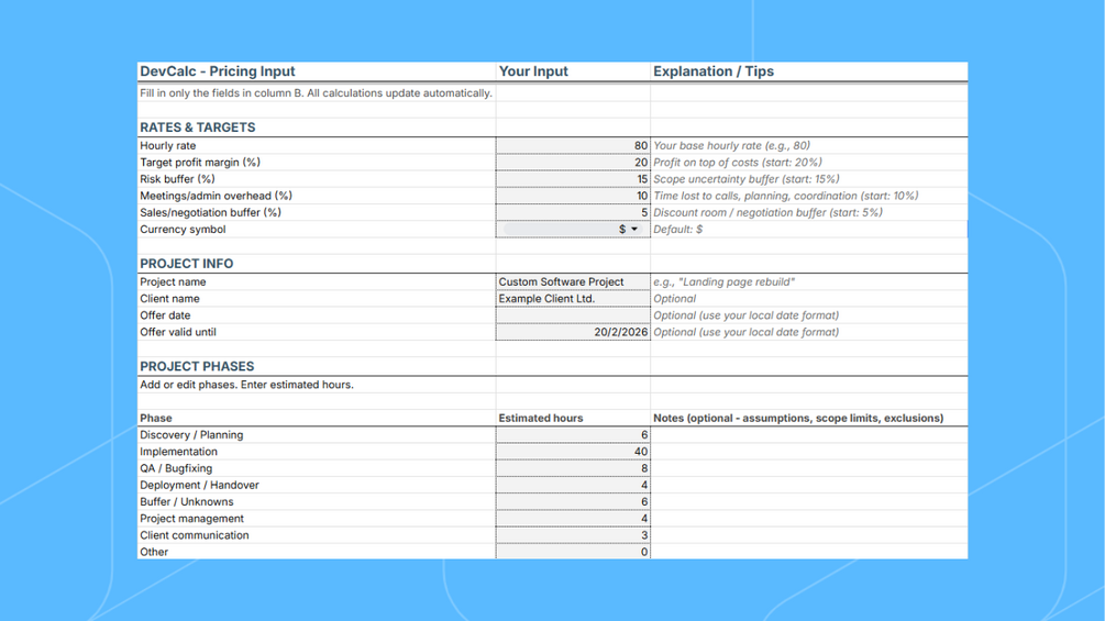 DevCalc is a simple Google Sheets calculator that helps freelance software and web developers price projects with confidence.